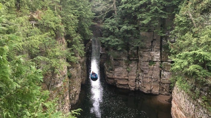 Ausable Chasm is an easy day trip if you are staying in the Adirondacks. From Lake Placid, Ausable Chasm is about 25 miles away, and it is about 50 miles away from Lake George. You can even tack it onto a road trip to Montreal, which is about 75 miles (120 kilometers) to the north, and about a 1 hour and 40 minute drive, depending on traffic and border crossing times.