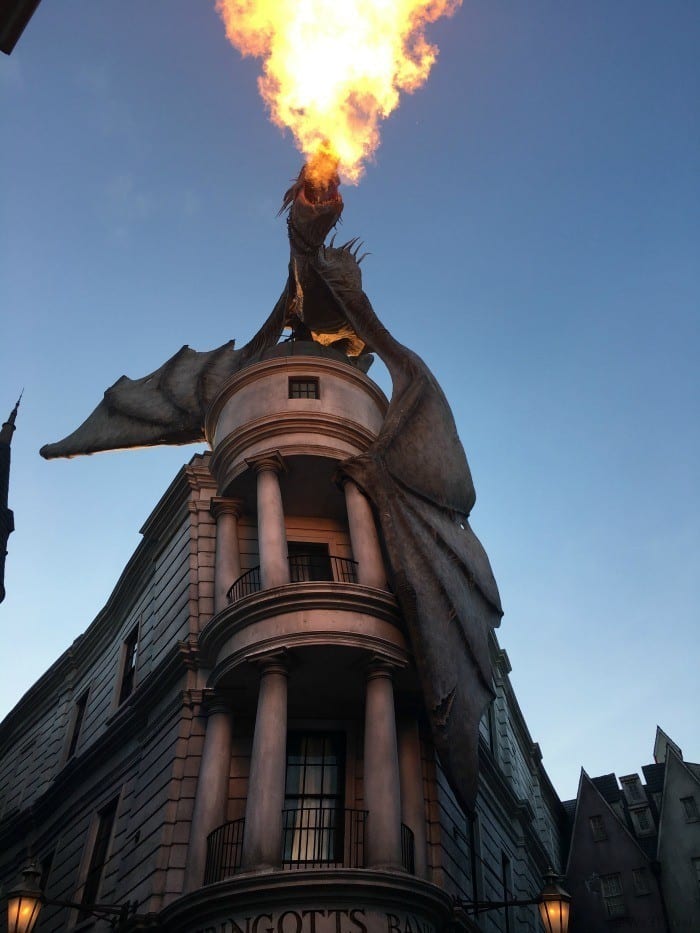 I like to be there either early in the morning and/or in the evening. I find there is a really special feel to Diagon Alley in the evening. The light adds to the magic and when the dragon breathes fire, it is even more impressive.